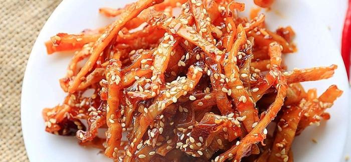 芽莊的魷魚條是用新鮮的魷魚,曬乾後,將其捲起來,切成一塊塊,然後用各種鹹、辣、甜、酸的香料混合醃製。這是一道質樸但令人上癮的美食,可作為禮物買回去跟家人朋友分享。