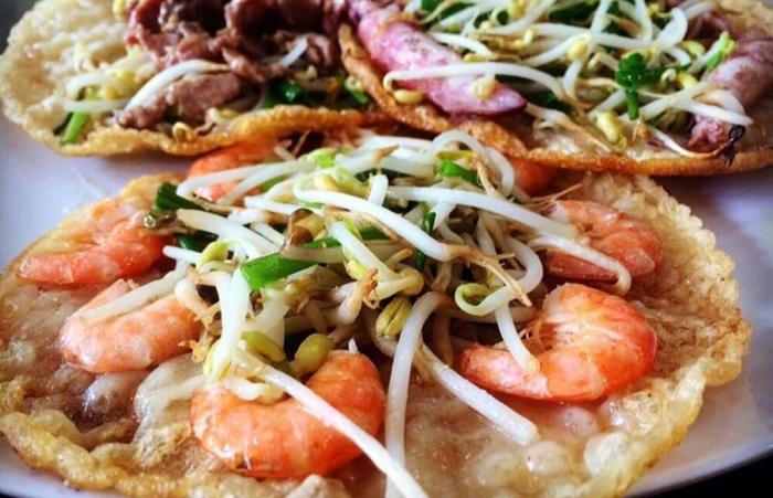 這是芽莊一道非常接地氣的小吃,是非常容易找到的美味小吃。它是將魷魚、蝦、豆芽、鵪鶉蛋等混合在一起的炸餅,有點像中國的炸蝦餅,當地人喜歡把它跟生菜、魚露一起吃。
