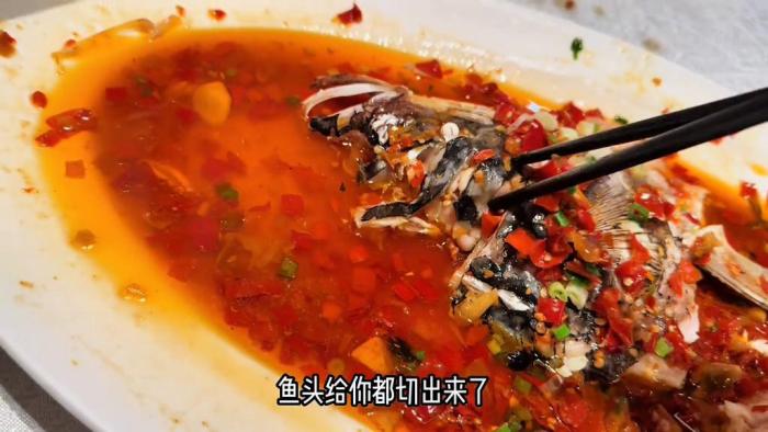 特別鮮的魚肉,它剁椒是微鹹,但是很入味。確實是今天可能,怪不得排名第一衣,但它為什麼有魚鱗?我剛吃好幾個都有魚鱗。這個剁椒魚頭真的推薦。他們家最牛的一點是你看這個魚頭,真是,你看它這個稜了嗎?魚頭給你都切出來了,這樣子就很好吃,魚頭就不至於浪費。這個這個是真不錯,都挺好。