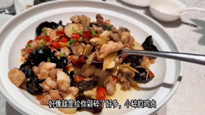 普通的辣椒炒雞,雞肉稍微有點偏幹偏硬,關鍵還特別碎。茶油香?非得要好好喝確實有,也不是很辣。我覺得這個一般特別微微辣這種雞肉,讓我覺得吃的可不爽了。因為你就想一口咬一塊大雞肉吃,這雞肉本身一般,感覺雞肉不是特別好,沒有什麼雞肉的香味。