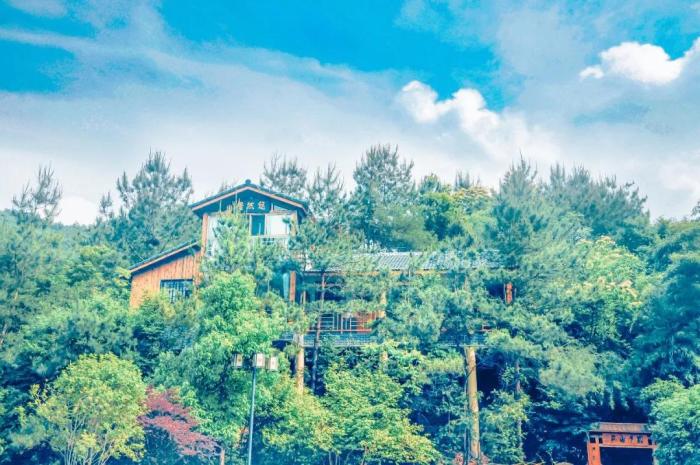 綠樹叢中依山就勢建造的每棟民宿,均獨立掩映於以松樹與山茶花為主、林相極好的立體混交林中。各具個性特色,格調高雅,寧靜質樸,詩趣盎然。