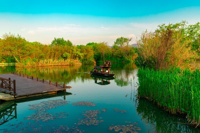 中國首個城市溼地公園,80元坐搖櫓船穿越蘆葦蕩[4],聽船孃哼越劇小調。秋季火柿節滿樹橙紅,冬季雪落梅林暗香浮動,都市裡的“綠野仙蹤”。